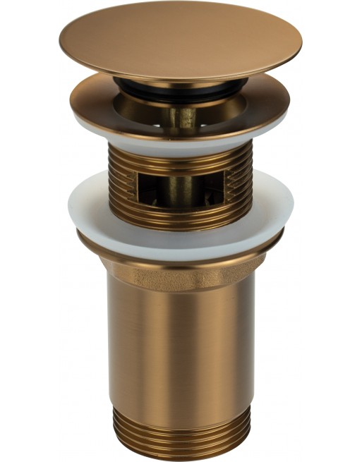 Mosiężny korek click-clack charakteryzuje się uniwersalnym zastosowaniem. Jest to korek bidetowy i umywalkowy. Tuleja pozwala na zamontowanie go zarówno do umywalek z przelewem, jak i bez przelewu. Otwarcie i zamknięcie odpływu następuje przez naciśnięcie korka palcem. Brązowe, szczotkowane wykończenie pasuje do armatury w tym samym kolorze i doskonale sprawdza się w przypadku cieplejszych aranżacji wnętrz.